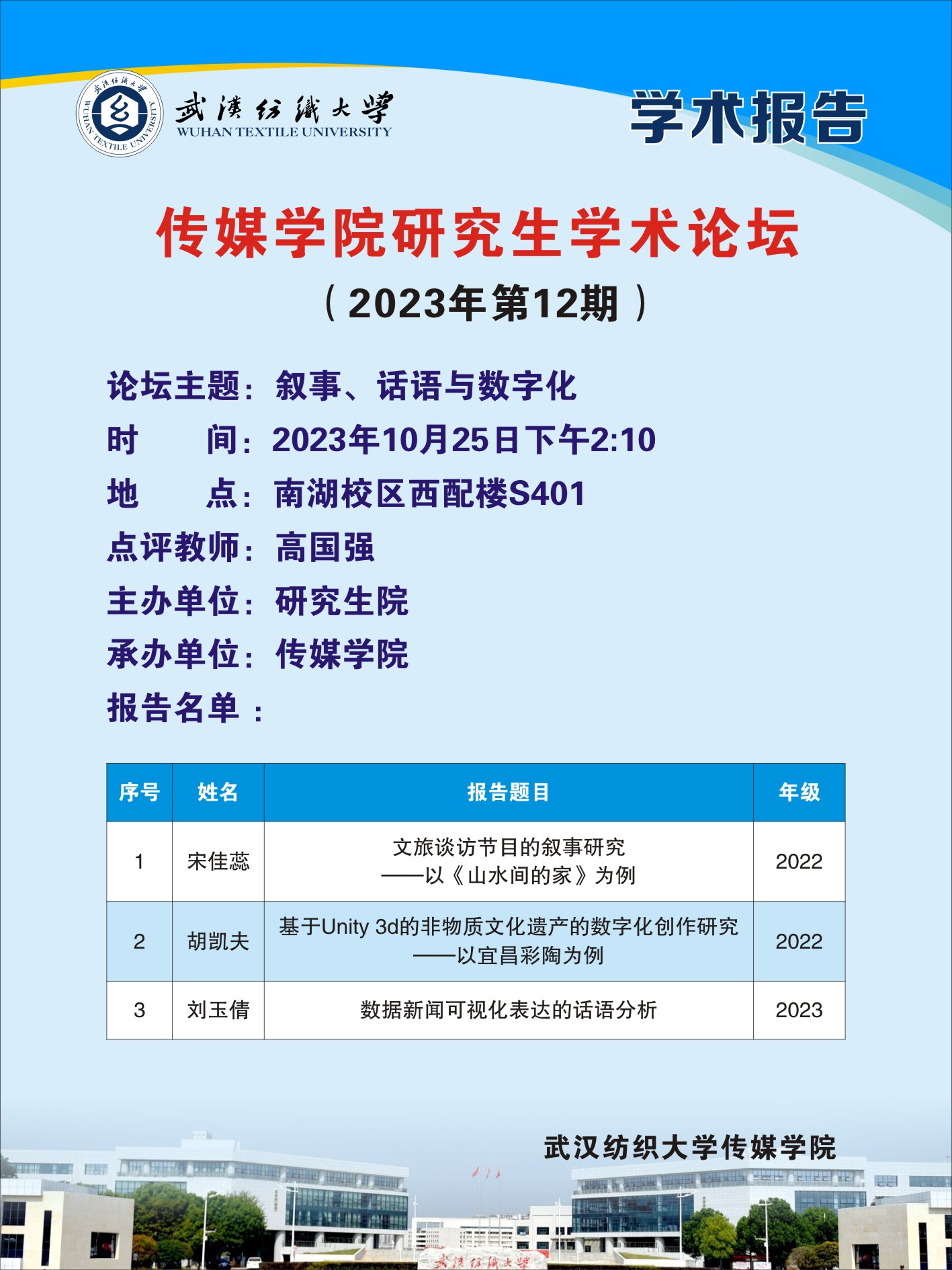 学术预告:第372期研究生学术论坛暨传媒学院2023年第12期研究生学术论坛