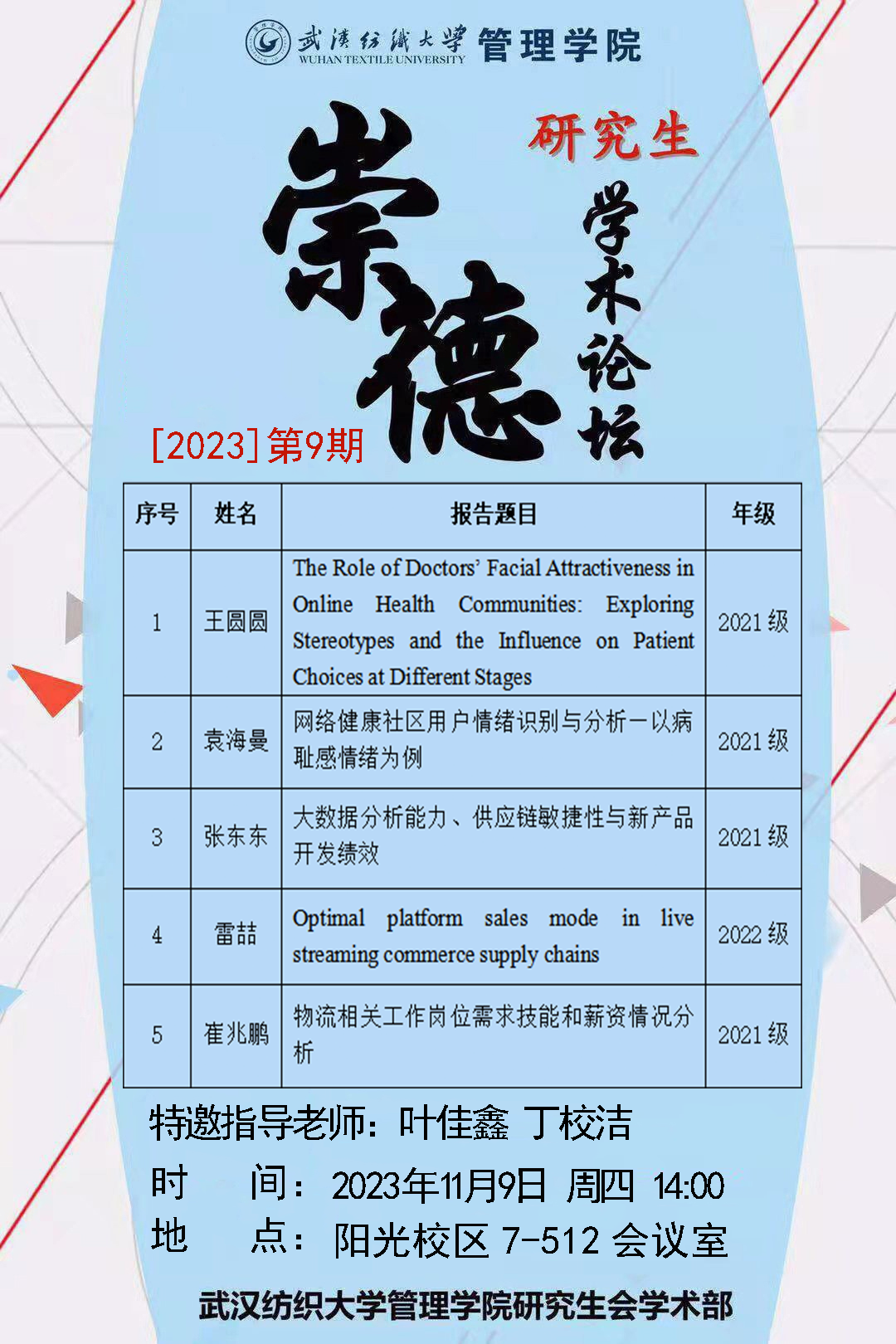 学术预告:第401期研究生学术论坛暨管理学院2023年第9期研究生学术论坛